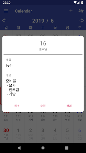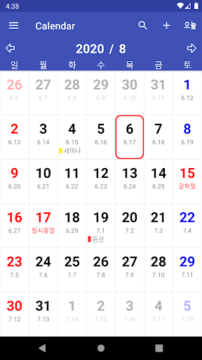 Main 화면에서는 휴일, 음력, 메모를 확인할 수 있다.